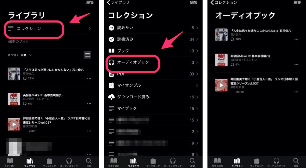 購入済みのオーディオブックは「ライブラリ」の「コレクション」>「オーディオブック」から確認することができます。
