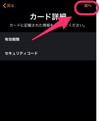 有効期限を確認し、セキュリティコードを入力します。問題なければ「次へ」をタップ。